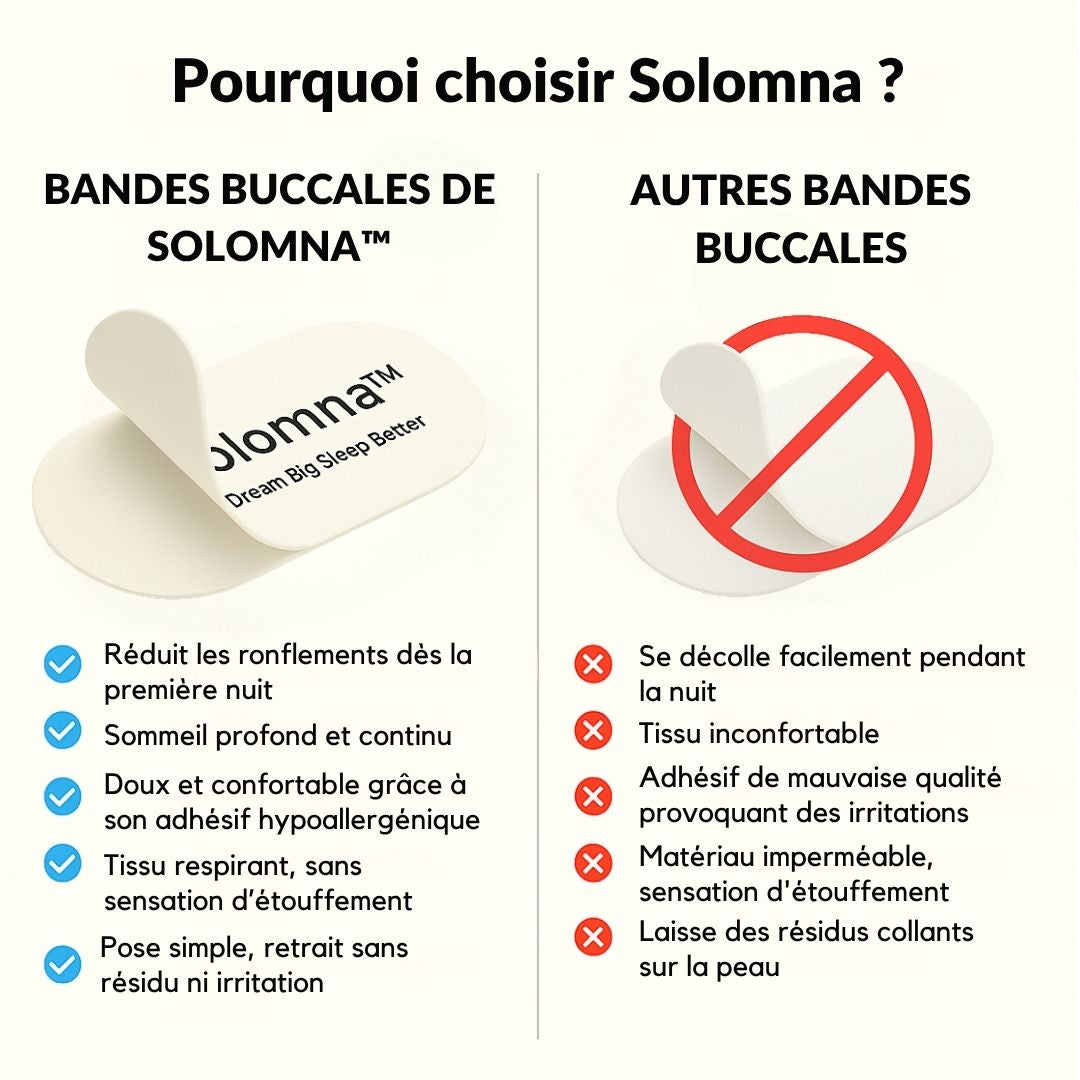 Le patch Solomna™ a été conçu pour résoudre les problèmes posés par les autres bandes buccales. Grâce à sa composition de haute qualité, il offre un plus grand confort, un adhésif hypoallergénique et une fixation sûre pour un meilleur repos.